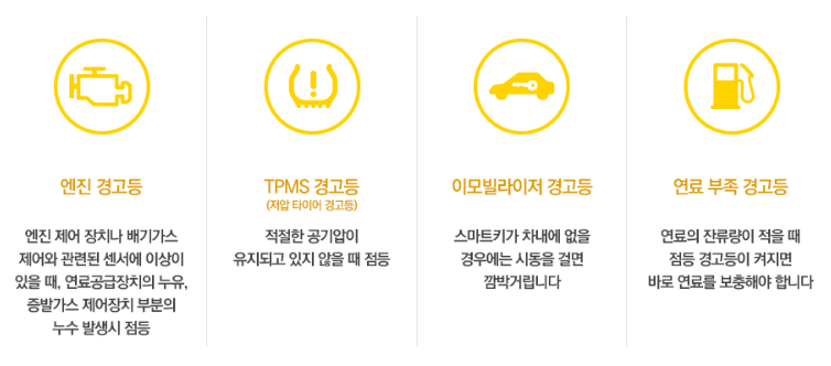엔진 경고등은 엔진의 정상적인 작동을 제어하는 엔진 전자제어 장치나 배기가스 제어에 관계되는 각종 센서에 이상이 있을 때, 연료 공급장치의 누유, 증발 가스 제어장치 부분의 누수 발생 시 켜집니다. 엔진 경고등이 켜진 채로 주행할 시, 운전성능과 연료 소비에 영향을 주는 배기 제어 계통이 손상될 수 있으니 가능한 한 빨리 정비소에 가서 정비를 받아야 합니다.